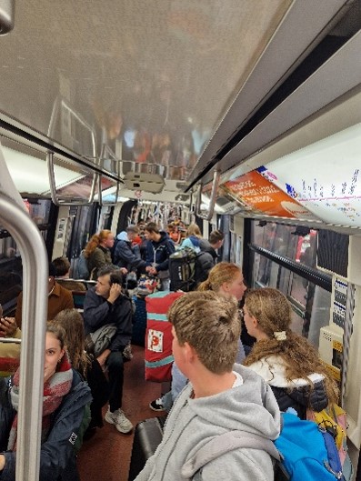Unsere Reise startete am Dienstag, den 07.10.2025, um 7.00 Uhr mit dem Zug am Kieler Hauptbahnhof. Wir fuhren das erste Mal mit der Bahn, weil wir keine andere deutsche Partnerschule mehr hatten, mit der wir einen Bus teilen konnten. Der aufregendste Teil der Reise war das Umsteigen in Paris: angekommen am Gare de L’Est, mussten wir durch das Tunnelsystem mit der Metro zum Gare de Montparnasse, um von dort aus den TGV nach Rennes zu nehmen. Wir kamen abends am 07.10.25 gegen 20.30 Uhr am Bahnhof in Rennes an. Die Schülerinnen und Schüler wurden von ihren Gastfamilien in Empfang genommen und verbrachten einen ersten Abend und eine erste Nacht in der französischen Familie.