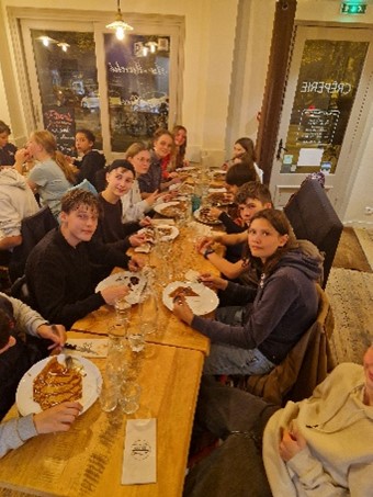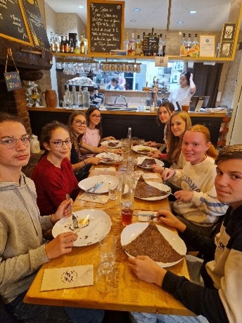 Die Schülerinnen und Schüler haben am Projekttag den Film "Monsieur Mathieu und seine Kinder" angeschaut. Anschließend haben wir uns auf den Weg gemacht zur Bäckerei Restez am Wilhelmplatz. Dort haben alle etwas auf französisch bestellt. Dann haben wir die köstlichen Backwaren vor Ort verspeist und sind anschließend mit dem Bus wieder zurück zur Schule gefahren.