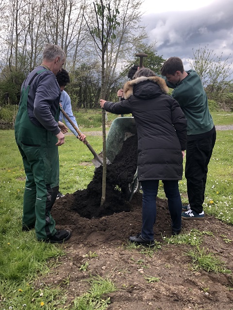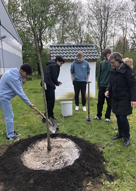 Pünktlich um 13.30 Uhr wurde der erste Spatenstich gesetzt, um ein genügend großes Loch für die Birne zu graben. Eifrig waren Karlo, Jacob, Jonas und Mahmoud am Werk und lauschten den fachkundigen Ratschlägen Herrn Wittkes. Der Baum wurde dann gemeinschaftlich mit Frau Dr. Schweiger gepflanzt. Im Anschluss wässerten die Schüler sorgfältig den Baum und verschlossen das Loch mit Erde.