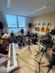 Ende April haben Herr Nies und Herr Engel für interessierte Schülerinnen und Schüler einen Instrumentenworkshop durchgeführt. Schülerinnen und Schüler hatten die Möglichkeit, Instrumente wie Schlagzeug, Cajon, E- Gitarre, Bass und Keyboard auszuprobieren.