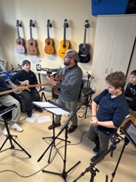 Im Anschluss konnten die beiden Schulbands einen zweistündigen Workshop mit dem Künstler genießen- Die Bandmitglieder spielten mit Goodman zusammen und es entstand ein gemeinsamer Song, der am Ende des Schultages präsentiert wurde.