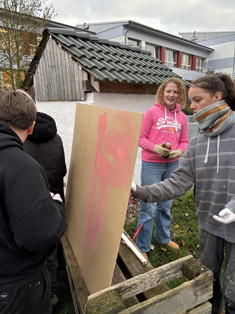 Am 25.11. hatte wir Besuch von Olli, der uns gezeigt hat, wie man professionell Graffiti sprayt. Wir hatte sehr viel Spaß und waren erstaunt, was man mit einer Sprühdose alles auf die Wand bringen kann! Wir haben nicht gewusst, dass die einzelnen Farben so gut decken und es eine so große Anzahl von „Caps“ gibt, die ganz unterschiedliche Sprüheigenschaften haben. Wir durften alle selbst ausprobieren, wie es sich anfühlt auf eine Wand zu sprühen. Ganz nebenbei berichtete uns Olli, welche Strafen man zu erwarten hat, wenn man illegal auf öffentlichen Flächen sprüht! Bis zu 2000 € muss man dann aufbringen, um die Reinigung zu bezahlen. Am Ende haben wir noch ein Gemeinschaftswerk erstellt: „GemsKro“ in Floppybuchstaben. Vielen Dank an Olli für den coolen Vormittag!!