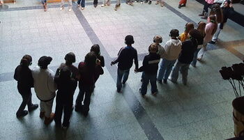 Wie begrüßen sich Kinder morgens in einer Schule in Frankfurt? Wie in São Paulo oder in Beirut? Wie klingt das Meer am Strand in La Union auf den Philippinen? Kinder aus verschiedenen Teilen der Welt haben sich Sprachnachrichten geschickt, aus ihrem Alltag erzählt und ihre Lieblingstänze erklärt. Daraus ist, in Zusammenarbeit mit einem Team aus internationalen Choreograf*innen, bestehend aus Ghida Hachicho, Alejandro Ahmed und Eisa Jocson, ein performatives Hörspiel entstanden, das das Publikum zum Mitmachen, Mittanzen und Kennenlernen einlädt: Über Kopfhörer erhielten alle Schülerinnen und Schüler die gleichen choreografischen Anweisungen, die die Gruppe tänzerisch durch die Räume des Werks leiteten und einen gemeinsamen Rhythmus finden ließen.